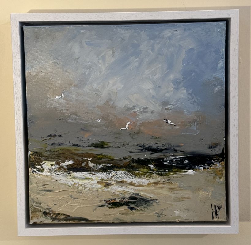 Original artwork, acrylic on box canvas, framed in a deep white box tray frame. By Hettie Pittman