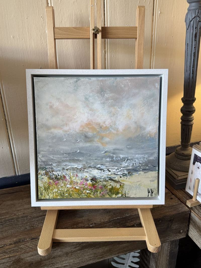 Original artwork, acrylic on box canvas, framed in a deep edge white tray frame. By Hettie Pittman. Overall size 33.5 x 33.5 x 5.5 cms
