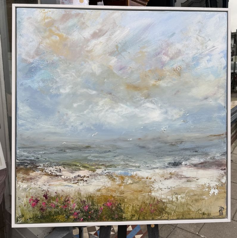 Original artwork, acrylic on box canvas in a deep edge white box frame. Overall framed size 94 x 94 x 5.5 cms