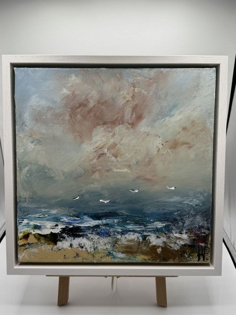 Original artwork, acrylic on box canvas, framed in a deep white edge tray frame