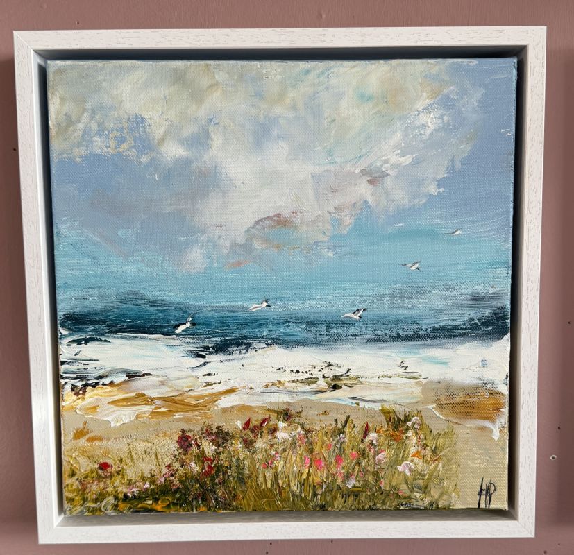 Original artwork, acrylic on box canvas, framed in a deep edge white box tray frame